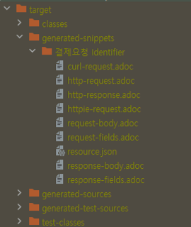테스트를 실행하고 통과를 하면 target 디렉토리에 generated-snippets 에 api 문서 작성에 필요한 adoc 파일들이 생성됩니다.