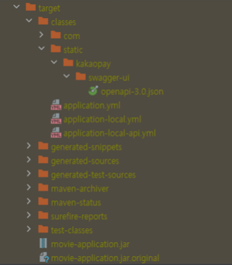 Spring Rest Docs 를 이용해 문서를 만들때도 이러한 파일들이 생깁니다. 이제 OpenAPI Spec을 만들어주는 플로그인을 pom.xml 에 추가해줍니다.