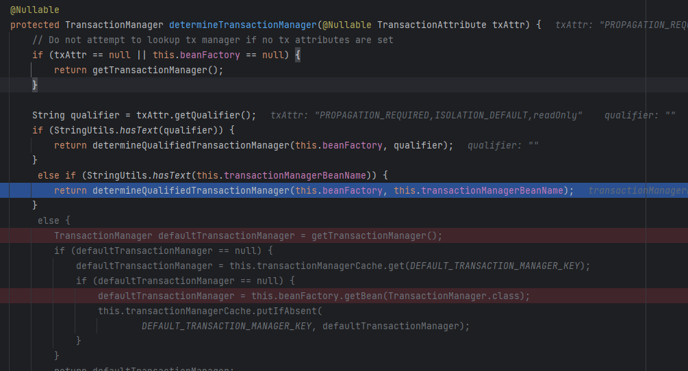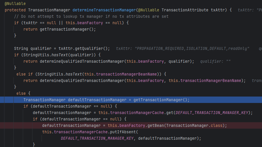 위에서 호출 했을 땐 transactionManagerBean 이 값이 없어서 아래의 로직을 실행했는데, 여기서는 트랜잭션이 실행된 후니까 determineQualifiedTransactionalManager() 를 호출하게 된다.