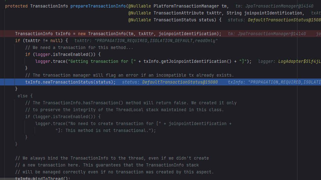 handlerExistingTransaction 에서는 트랜잭션에 설정된 속성에 따른 처리를 하고 마지막에 TransactionSynchronizationManager 의 값을 설정하고 TransactionStatus 를 반환한다. 이제 TransactionAspectSupport 의 createTransactionIfNecessary 에 있는 prepareTransactionInfo 메서드를 실행한다.