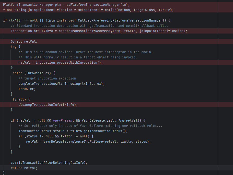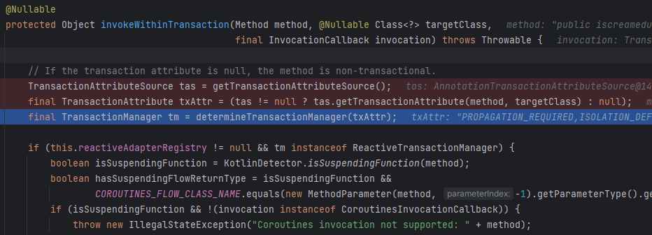이 메서드 에서 트랜잭션의 속성을 얻고 트랜잭션 매니저를 결정한다. 트랜잭션 속성은 @Transactional 에 정의된 속성이다. 이 트랜잭션에서는 PROPAGATION_REQUIRED, ISOLATION_DEFAULT, readOnly 속성이 있다.