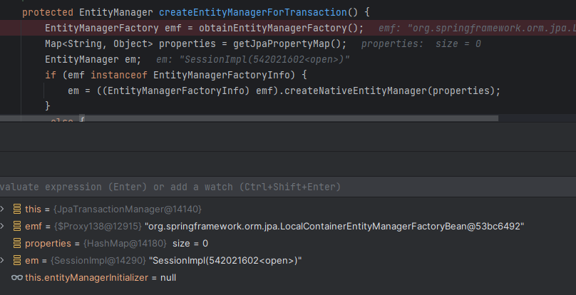 createNativeEntityManager 메서드를 호출하면 위와 같이 SessionImpl 이 생성된다. 생성된 newEm 엔티티 매니저 객체를 EntityManagerHolder 로 생성해 트랜잭션에 set 한다.