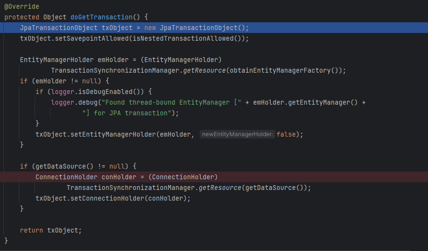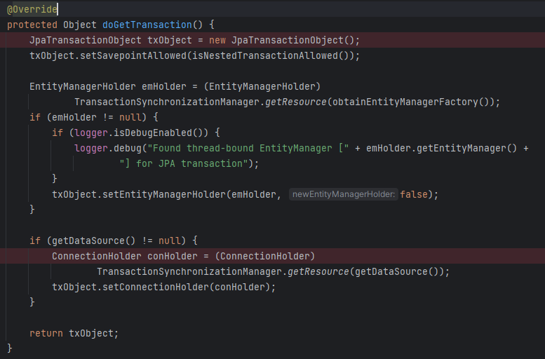 트랜잭션을 생성할 땐 emHolder, conHolder 가 null 이었지만 여기서는 아니다. 위에 트랜잭션 리소스 등록을 보면 TransactionSynchronizationManager 를 통해 리소스를 등록하는 부분이 있었다. 이 로직은 그 부분에서 등록한 엔티티 매니저 홀더와 커넥션 홀더를 가져와 트랜잭션 객체에 설정해주는 로직이다.