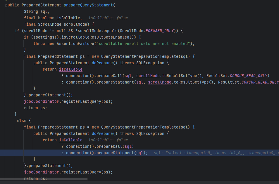 새로운 트랜잭션 객체를 만들고 TransactionStatus 를 설정해준다. 이제 트랜잭션 세팅이 끝났으니 쿼리를 실행하는 로직으로 넘어간다. QueryExecutorMethodInterceptor#invoke -> QueryExecutorResultHandler#postProcessInvocationResult -> RepositoryFactorySupport#invoke 를 호출한다. 그 이후로도 쿼리와 관련된 메서드가 호출되는 것을 확인할 수 있다. RepositoryCompository -> RepositoryMethodInvoker -> SimpleJpaRepository -> QueryTranslatorImpl -> QueryLoader -> Loader -> StatementPrepareImpl 호출이 된다. 이제야 이 훑어보기 글의 목적이 되는 부분이 나온다.