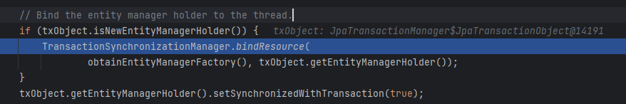 위에서는 DataSource를 key 로 ConnectionHolder value 로 저장했고, 그다음에는 EntityManagerFactory 를 key, EntityManagerHolder 를 value 로 저장한다. 그리고 트랜잭션의 EntityManagerHolder 를 가져와 싱크를 true 로 설정하는 로직이 있다. 여기까지가 AbstractPlatformTransactionManager#startTransaction 메서드의 끝이다. 이후엔 TransactionAspectSupport -> TransactionInterceptor -> CglibAopProxy 로 돌아와 AOP 로 감싸고 있는 비즈니스 로직을 실행하게 된다.