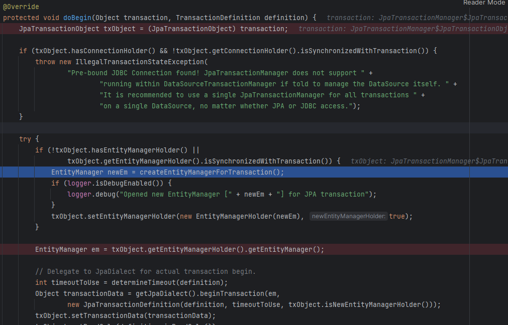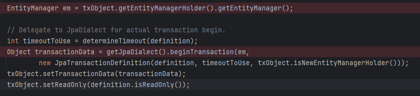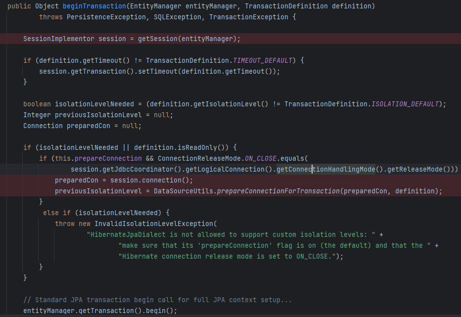 새로 생성된 엔티티 매니저를 사용해 getJpaDialect().beginTransaction 을 호출하자. Hibernate를 사용했으니 HibernateJpaDialect #beginTransaction 을 호출한다.