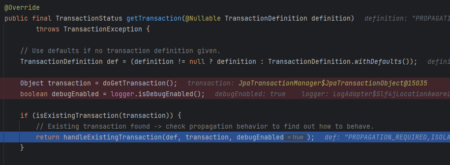 트랜잭션을 생성할 땐 isExistionTransaction 이 false 라 이 로직을 안탔지만, 이번에는 트랜잭션이 존재하기 때문에 이 로직을 타게 됐다.