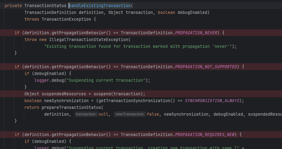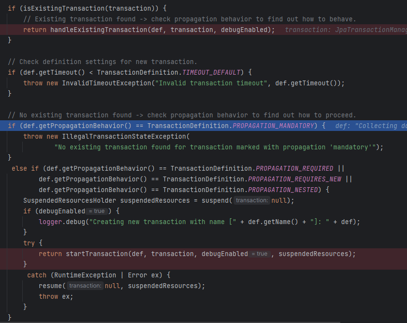 그 다음에는 PROPAGATION_MANDATORY 면 예외를 일으키는 로직이 있다. PROPAGATION_MANDATORY 는 이전 트랜잭션이 존재하면 그 이전 트랜잭션을 사용하는 옵션이다. 그리고 이전 트랜잭션은 반드시 존재해야만 한다. 만약 PROPAGATION_MANDATORY 설정이고 이전 트랜잭션이 없는 첫번째 트랜잭션이면 예외가 발생한다. 그리고 이제 AbstractPlatformTransactionManager 의 startTransaction을 실행해보자.