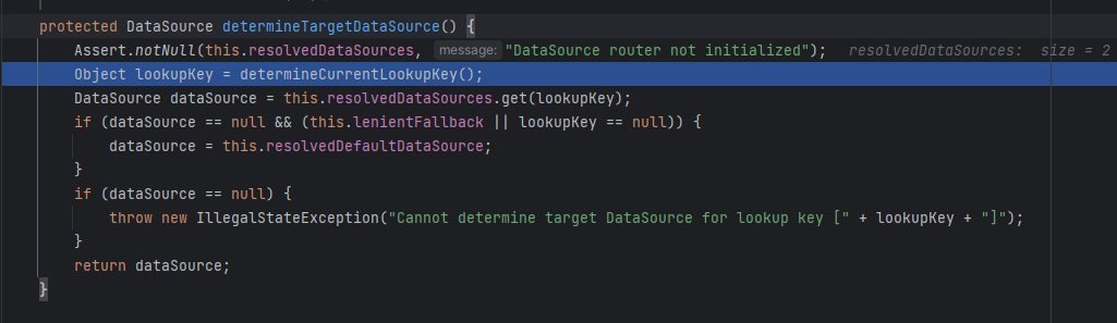 DataSource 를 얻고 커넥션을 얻어 오는 부분의 로직을 보면 익숙한 메서드가 보인다. 바로 determineTargetDataSource 이다. RoutingDataSourceRouter 을 정의할 때 AbstractRoutingDataSource 를 상속받아 오버라이딩한 메서드다.