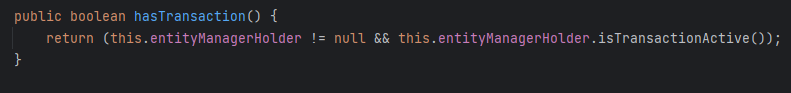 내부 로직을 확인해보면 JpaTransactionManager#hasTransaction 에 entityManagerHolder 를 확인하는데 현재 사용중인 entityManageHolder 가 없기 때문에 isExistingTransaction 은 false 가 나오게 된다. 첫번째 트랜잭션 생성 로직을 수행한 이후의 트랜잭션을 마주하게 되면 true 로 나와 해당 로직을 수행하게 되는 것 같다.