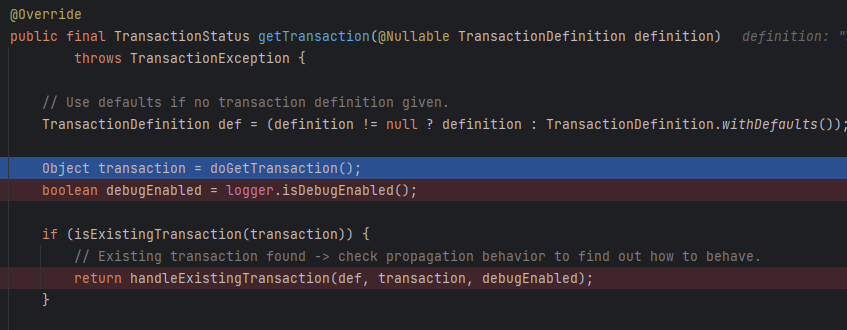 이제 TransactionalAspectSupport 로 돌아오면 트랜잭션을 만드는 로직을 볼 수 있다.createTransactionIfNecessary 메서드로 들어가면 트랜잭션 매니저를 통해 트랜잭션을 얻는 로직이 있다. tm.getTransaction 을 호출하면 PlatformTransactionManager 구현체인 AbstractPlatformTransactionManager#getTransaction 을 호출하게 된다.