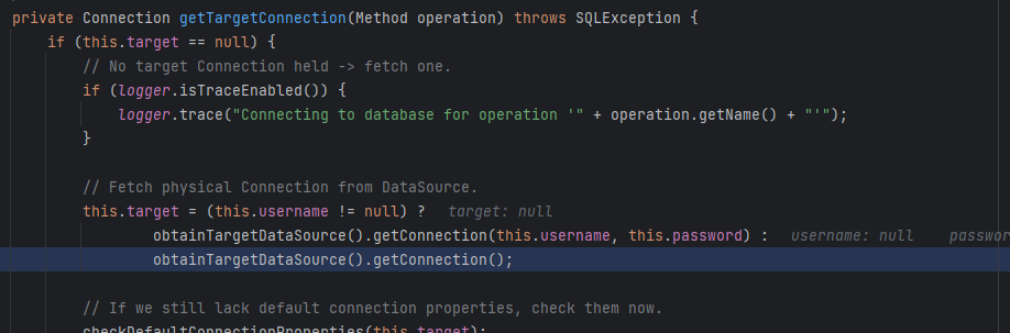 connection 을 얻어 쿼리를 실행하는 부분이다. connection 을 얻어오는 부분을 타고 들어가면 LazyConnectionDataSourceProxy 가 나온다.