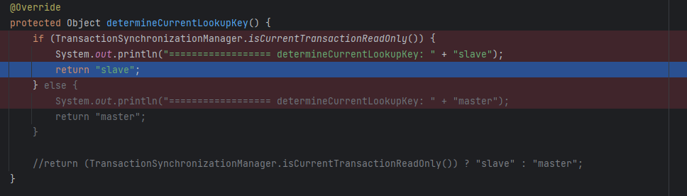 트랜잭션에 readOnly 가 있으니 slave 를 반환한다.