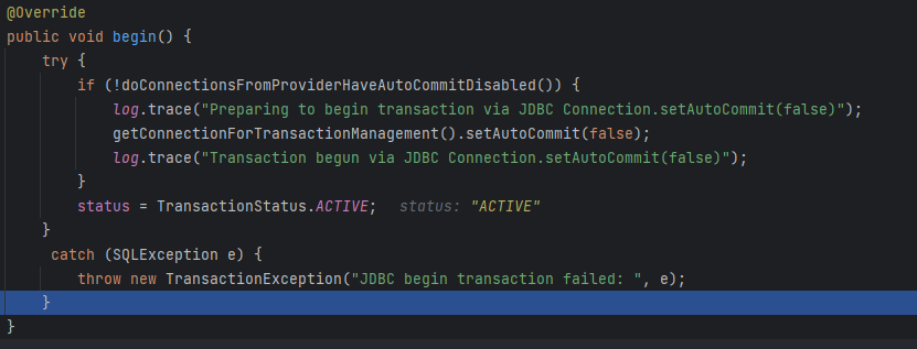 그리고 begin() 메서드를 호출해 코드를 추적하다 보면 AbstractLogicalConnectionImplementor#begin() 메서드를 호출해 트랜잭션의 상태를 ACTIVE 로 변경한다. 이제 JpaTransactionManager 로 돌아오면 아래와 같은 로직을 만나게 된다.